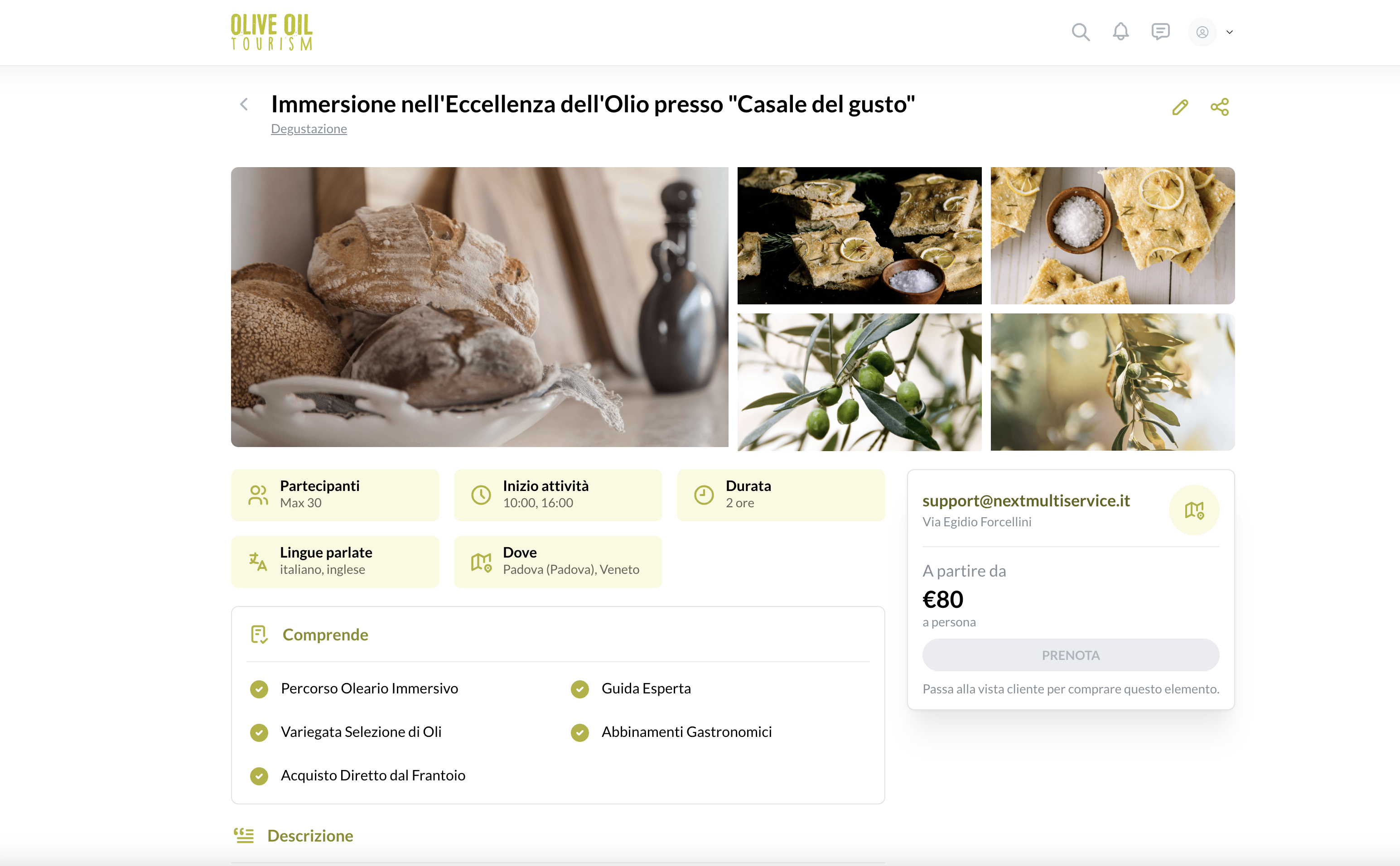 Esplora le meraviglie del mondo dell'olio d'oliva con la nostra piattaforma. OliveOil Tourism ti connette a esperienze uniche in incantevoli strutture. Prenota soggiorni immersi tra colline e uliveti, dove ogni momento è un viaggio sensoriale legato all'oro verde. Sperimenta percorsi tra gli ulivi alla scoperta del processo produttivo, fino a una degustazione guidata di oli pregiati e delizie locali. Un'esperienza avvolgente, arricchita dalla storia e dalla passione per l'olio extravergine di oliva. Porta a casa i ricordi di questo viaggio con l'acquisto diretto dal frantoio.